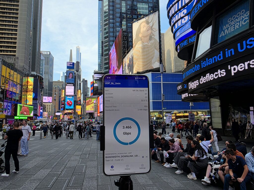 This short-form analysis compares mmWave (FR2) and sub-6 GHz (FR1) performance in Verizon’s 5G Standalone (SA) network using devices from two leading OEMs. As with our previous study, the devices are powered by chipsets from Qualcomm and Apple, representing the recent commercially available modem platforms from each vendor. Testing took place in Times Square, New York City in August 2025, an environment selected for its consistently high pedestrian density and unique RF conditions.