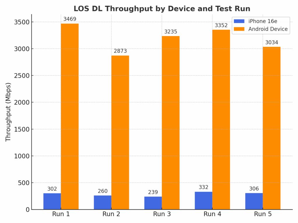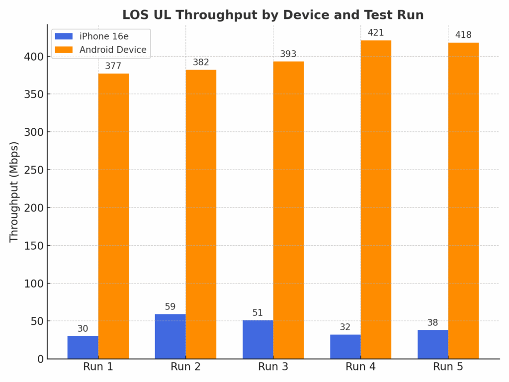 In LOS upload testing, the iPhone 16e averaged 42 Mbps, compared to 398 Mbps for the Android device. This represents over a 9X advantage for the Android device. These results highlight the substantial uplink performance gap between Apple’s first-generation C1 modem and Qualcomm’s Snapdragon X75 platform. An android device consistently leveraged advanced uplink carrier aggregation and higher spectral efficiency to deliver dramatically higher throughput, underscoring their ability to fully utilize Verizon’s 5G SA uplink capabilities in ideal LOS conditions. Here the Android device was able to attach to a single FR1 and 4 FR2 channels, while the iPhone could only use a single FR1 channel.