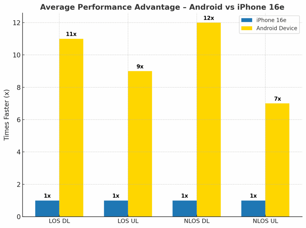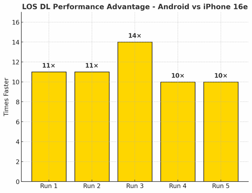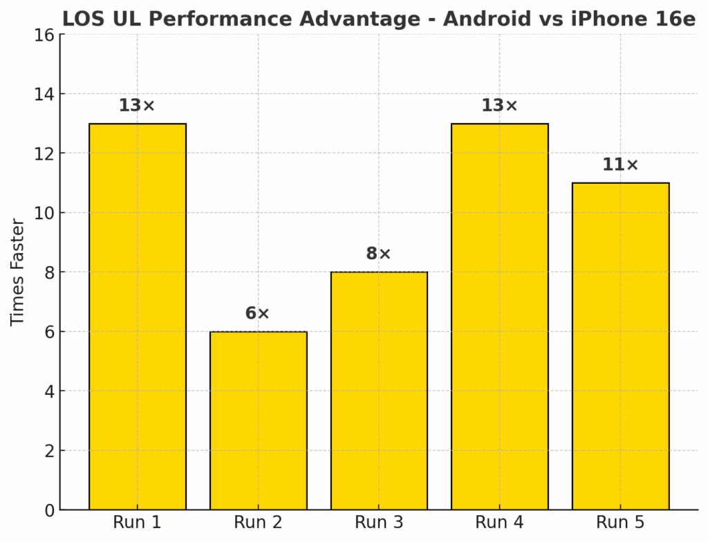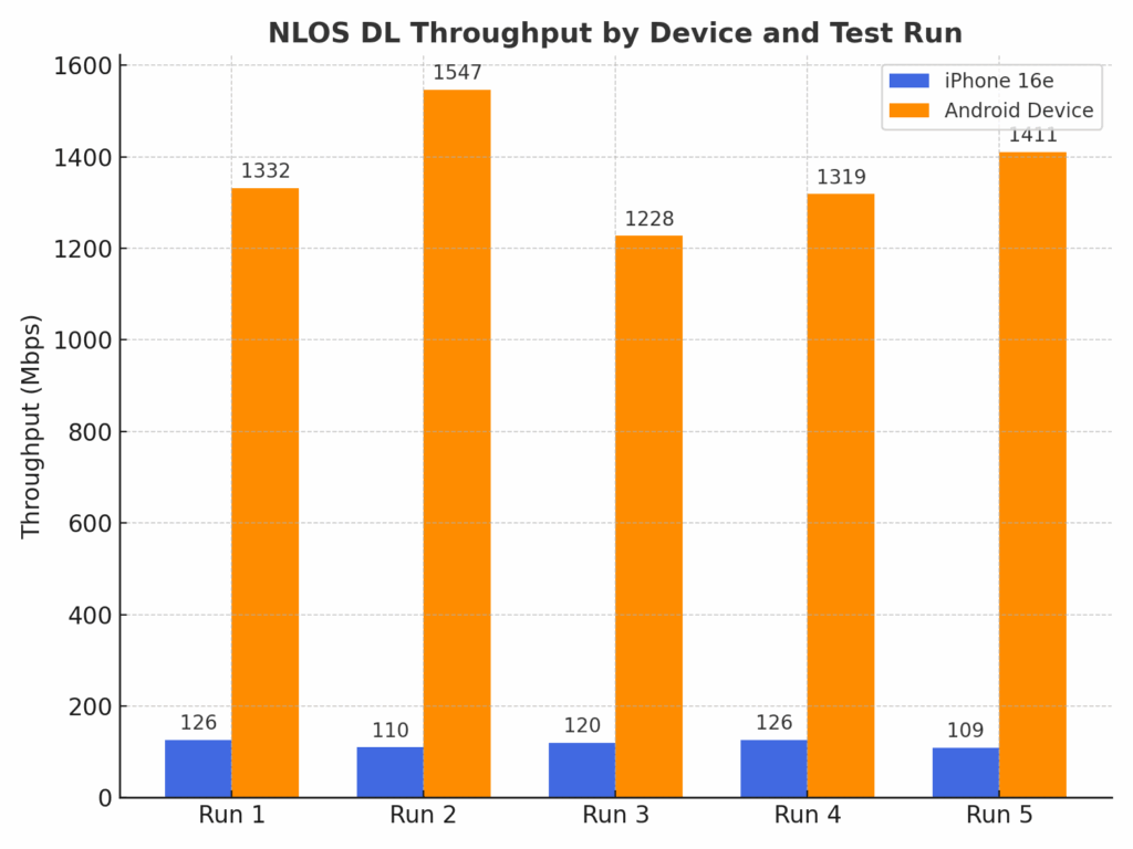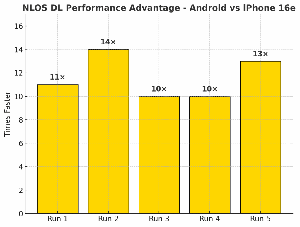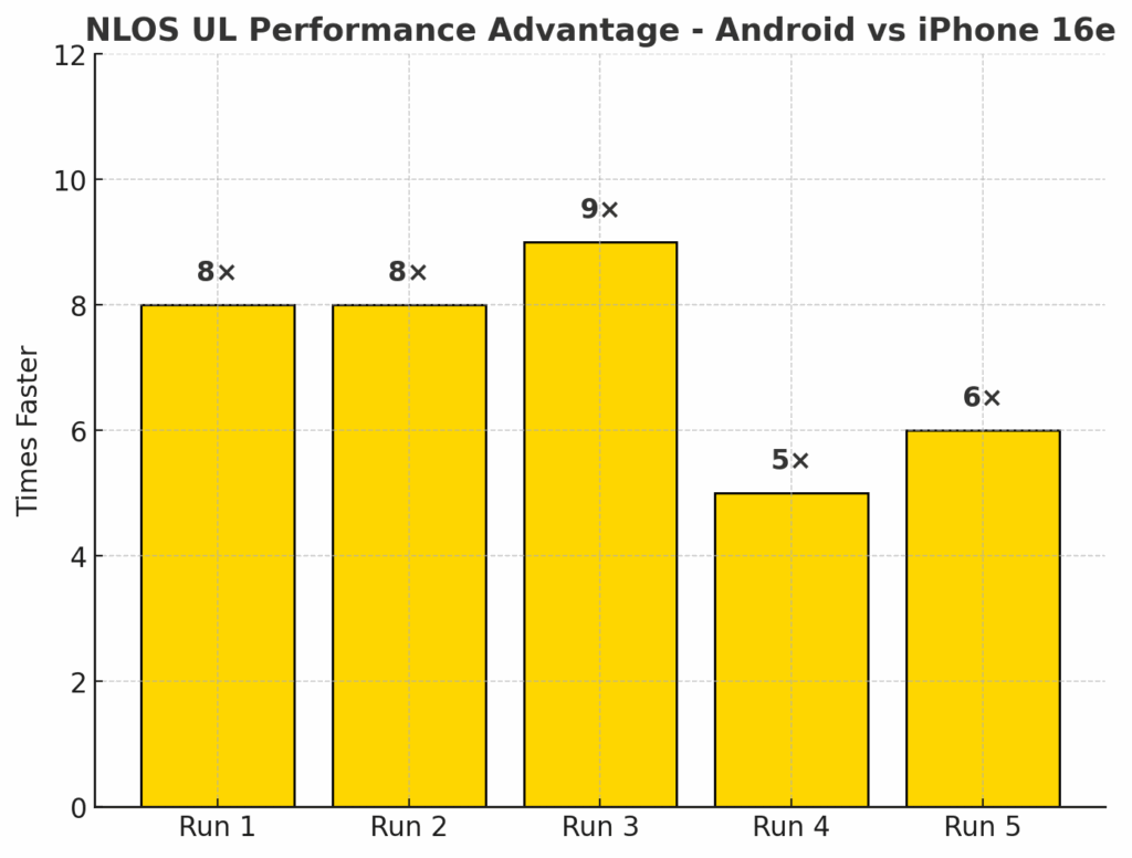 In NLOS download testing, the iPhone 16e averaged 118 Mbps, while the Android device reached 1,367 Mbps. This translates to the Android device being 12X faster than the iPhone 16e in these less than optimal RF conditions. The performance gap was consistent across all five runs, underscoring the Snapdragon X75 Modem-RF Systems’ ability to sustain high throughput even without direct line-of-sight to the mmWave node. By contrast, the iPhone was unable to take advantage of the full mmWave capacity in these scenarios, highlighting a substantial real-world performance disadvantage in dense urban environments where NLOS links are common.