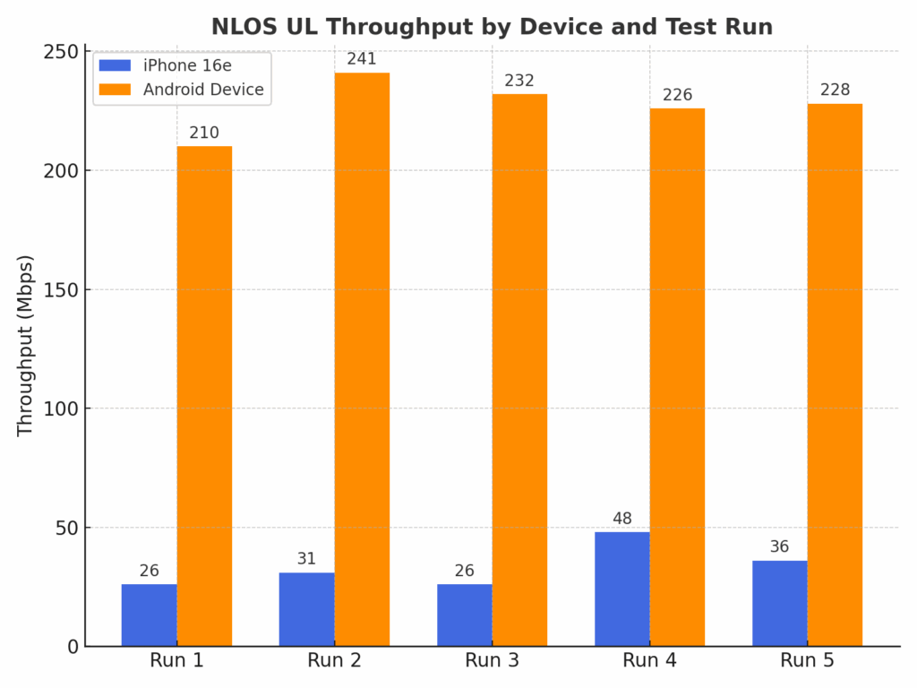 In NLOS upload throughput testing, the iPhone 16e averaged 33 Mbps, while the Android device reached 227 Mbps. This translates to the Android device being 7X faster than the iPhone 16e, again underscoring the significant uplink performance advantage of the Qualcomm-powered device under challenging RF conditions.