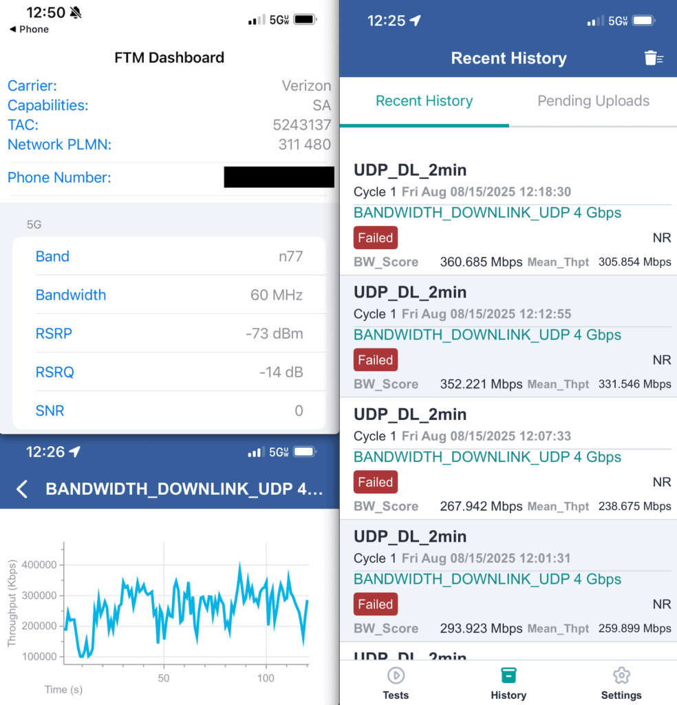 From a network perspective, Verizon’s scheduling of all DUTs to Standalone 5G by default, without manual intervention, underscores the operator’s progress in SA maturity and its ability to seamlessly integrate mmWave into the broader RAN architecture. The addition of the 10 MHz FDD n5 carrier to complement the dual n77 TDD layers further strengthens indoor coverage and uplink reliability, particularly for devices without FR2 access.